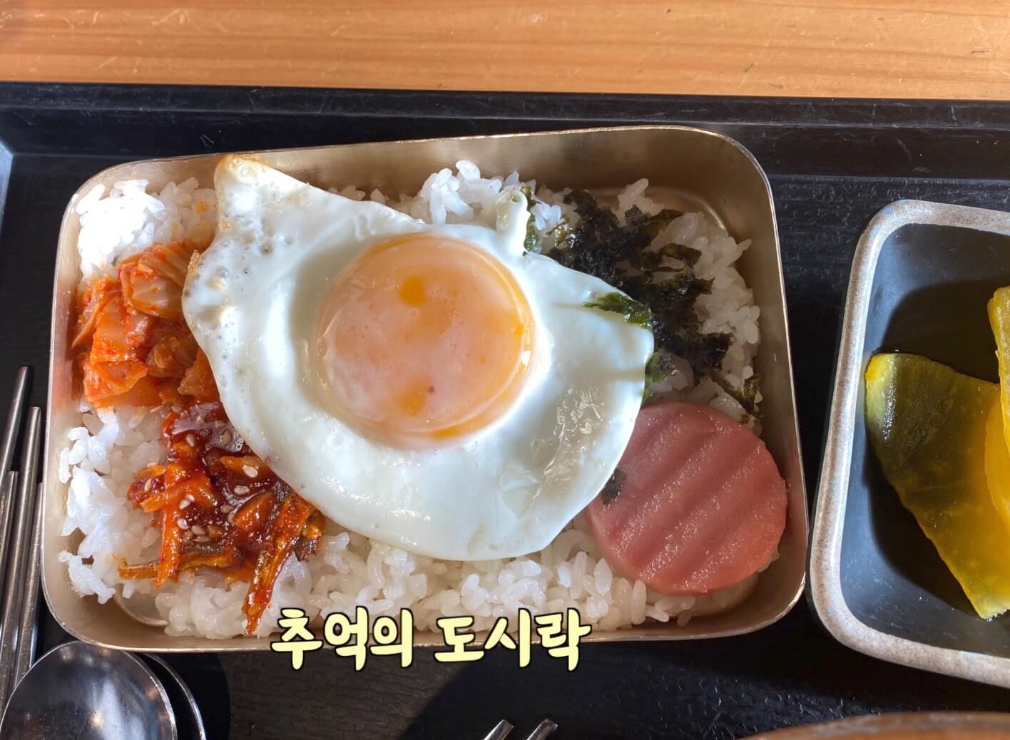 추억의 도시락엔 계란후라이, 김, 통햄, 김치볶음, 멸치