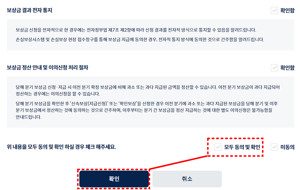 6~7곳을 확인해야 합니다. 아무것도 하지 않아도 하단의 “동의 및 확인”을 클릭합니다.확인 후 “확인” 버튼을 클릭합니다. 소상공인 손실보상 온라인으로 간단히 신청하세요.