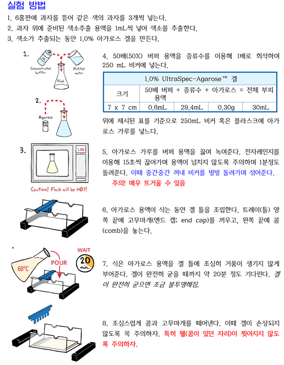 Skittles 또는 M&M의 이러한 정보와 색소는 전기영동으로 쉽게 추출 및 분리할 수 있습니다.. 같은 농도의 아가로스 젤, 같은 긴장, 같은 시간 동안 이동한 거리를 비교하여 어떤 색 사탕에 어떤 색이 포함되어 있는지 알아냅니다..