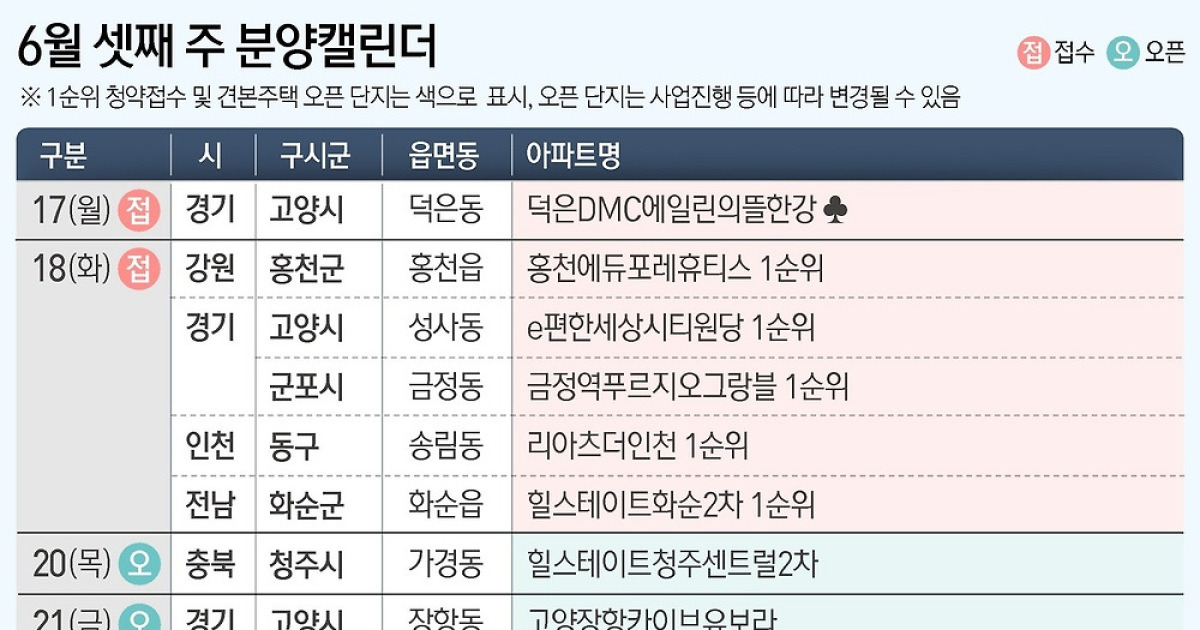 6월 둘째주 판매일정 – 수도권 주요 청약단지 입주자모집 공고요약